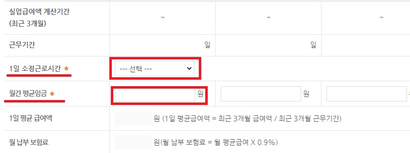 5. 다음으로 소정근로시간, 월간 평균임금을 입력해 주세요.