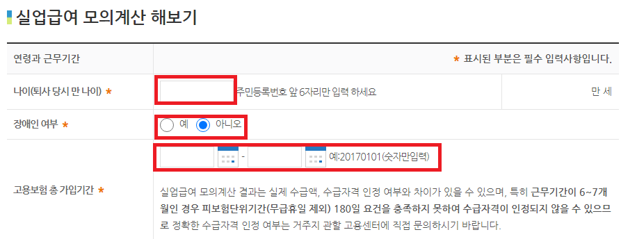 4. 그러면 실업급여 모의계산 해보기가 나옵니다. 여기에 나이, 장애인여부, 고용보험 가입기간 등을 입력해 주세요.