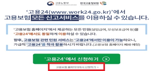 2. 만약 고용 보험 홈페이지에서 이 팝업화면이 먼저 뜬다면, 고용보험 홈페이지에서 신청하기를 눌러주세요.